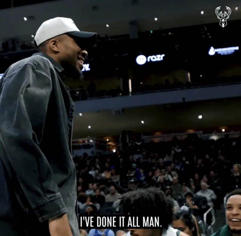 亚历克斯罚球拿到生涯首分后,字母哥场边调侃:嘿,伙计,我可以退役了,我已经功成名就了。